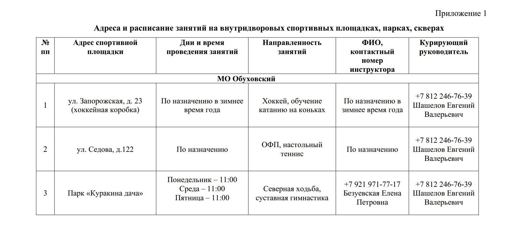 Санкт-Петербургское государственное бюджетное учреждение «Центр физической культуры, спорта и здоровья Невского района Санкт-Петербурга» сообщает, что на территории внутригородского муниципального образования Санкт-Петербурга муниципального округа Обуховский расположены и открыты для свободного посещения жителями внутридворовые спортивные площадки, находящиеся в ведении Учреждения. Инструкторами по спорту в соответствии с расписанием проводятся занятия, в том числе в парках и скверах.