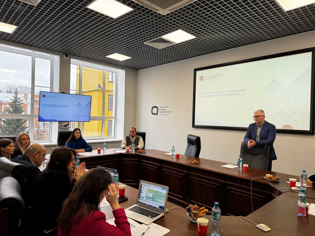 Начальник отдела производственной кооперации Центра «Мой бизнес» Санкт-Петербург (СПб ГБУ «ЦРПП») Игорь Федосов представил два стратегических проекта: «Оптимизация процесса организации и проведения Бирж поставщиков» и «Оптимизация процесса регистрации на сайте проекта «Бренды Петербурга».