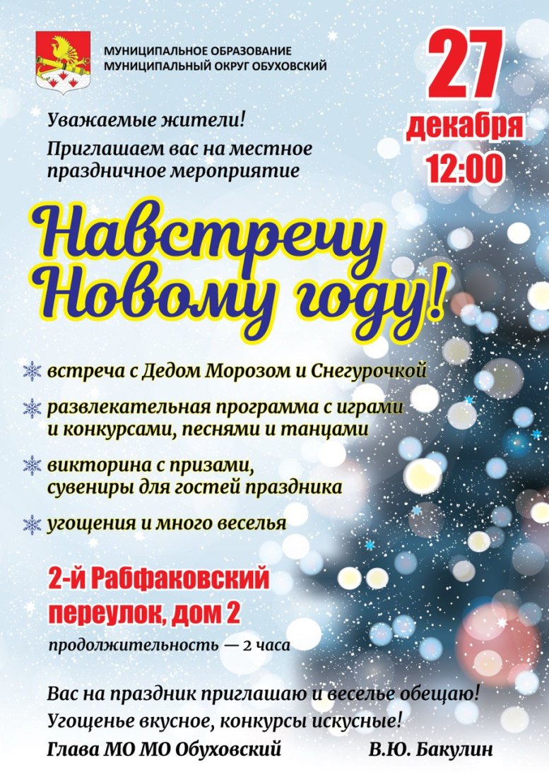 Уважаемые жители МО МО Обуховский! Приглашаем вас на местное праздничное мероприятие Опубликовано 17.12.2025 в рубрике Новости